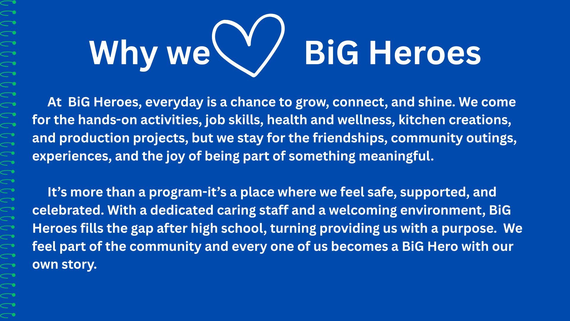 These members have been chosen by BiG Hero Staff because they have shown exemplary leadership skills. They are an integral part of the planning process at BiG Heroes.